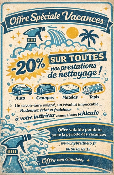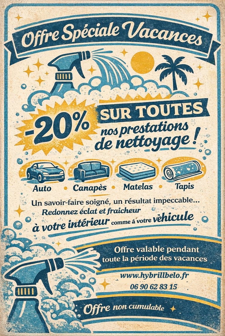 🌴✨ OFFRE SPÉCIALE VACANCES ✨🌴Profitez de -20% sur toutes nos prestations de nettoyage !🚗 Auto🛋️ Canapés🛏️ Matelas🧼 Tapis